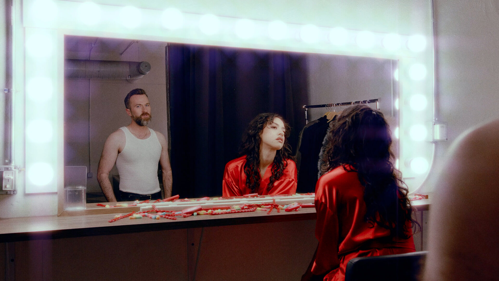 The accompanying video, directed by Peter Donaghy, brings this parable to flesh and performance. Tempting figures circle our protagonist like doomed constellations: magnetic, yet unable to close the gulf between them. Their orbit unfolds inside a theatre of want: pole dancers, bathed in strobing light, gesture their routines with professional precision. They are supposed to entice, yet the camera lingers on the vacant glaze in their eyes, on the way the dancers become wallpaper, ornament, static. Vice has curdled into monotony, sex becomes another currency drained of its charge. The viewer is left stranded in the hollow luxury of an endless party, Gatsby’s ballroom after dawn.