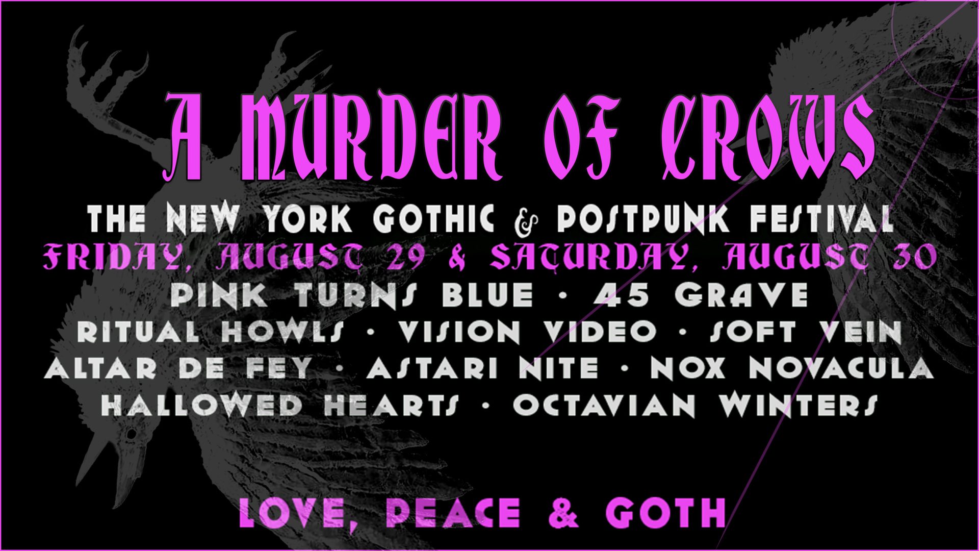 Born from twilight musings between NYC promoter Sean Templar, known for curating acclaimed goth nights The Red Party and Underworld, and fellow scene veterans Dave Bats (Los Angeles) and Martin Oldgoth (London), A Murder of Crows first took flight after a nocturnal epiphany at Leipzig’s Wave Gotik Treffen. Launched modestly in 2015 with just three bands and a quartet of DJs at Mercury Lounge, it swiftly expanded to two nights in 2016, augmented by a marathon Twitch stream in 2021, and further bolstered by a pre-party since 2023.