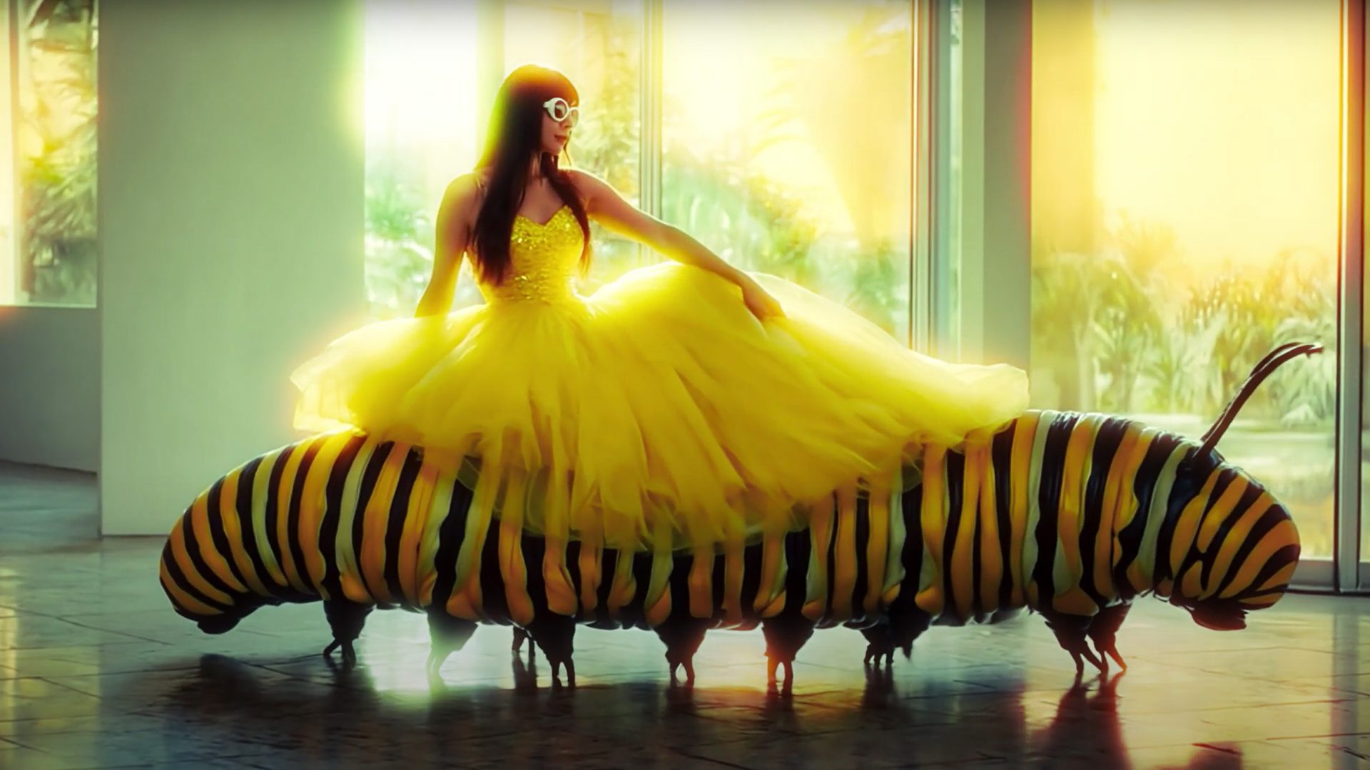The video, directed by Shana Nielsen (Sha Sabi of United Ghosts), is a dazzling spectacle where the ordinary mutates into the uncanny: a lawn becomes a stage for surreal pageantry, a giant caterpillar serves as transport through warped suburban Eden, and a house dissolves into end-of-days reverie. AI multiplies the band into kaleidoscopic clones caught between bliss and collapse. The effect is equal parts carnival and nightmare, like Ray Bradbury’s Something Wicked This Way Comes rewritten under strobe lights.